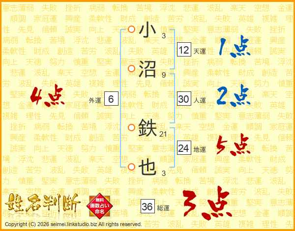 小沼鉄也さんの総運は36画の3点!