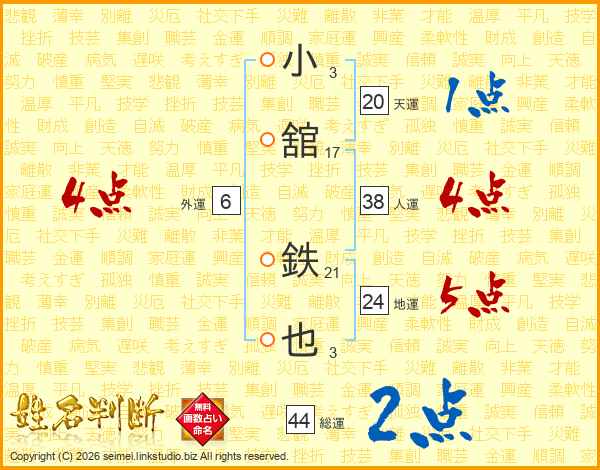 小(3画)舘(17画) 鉄(21画)也(3画)
