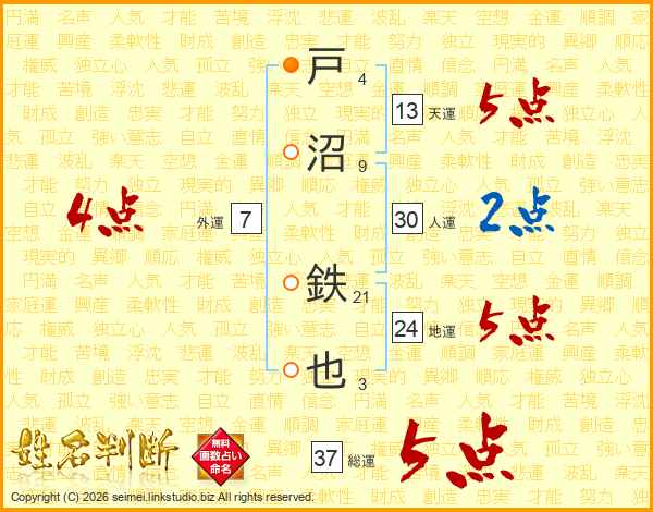 戸(4画)沼(9画) 鉄(21画)也(3画)
