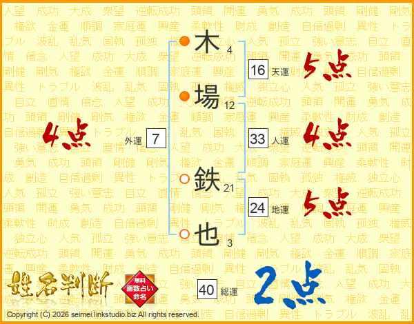 生活面を象徴する運勢です。外部から受ける影響力を表し、結婚運、家庭運や職場、環境への順応性を表します。総運から人運を引いた画数。姓や名が1文字の場合を除く。