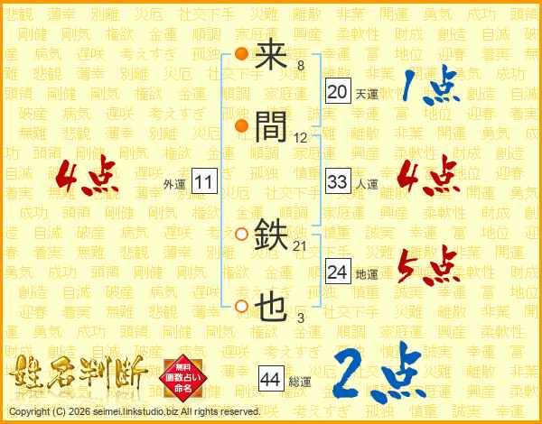 生活面を象徴する運勢です。外部から受ける影響力を表し、結婚運、家庭運や職場、環境への順応性を表します。総運から人運を引いた画数。姓や名が1文字の場合を除く。