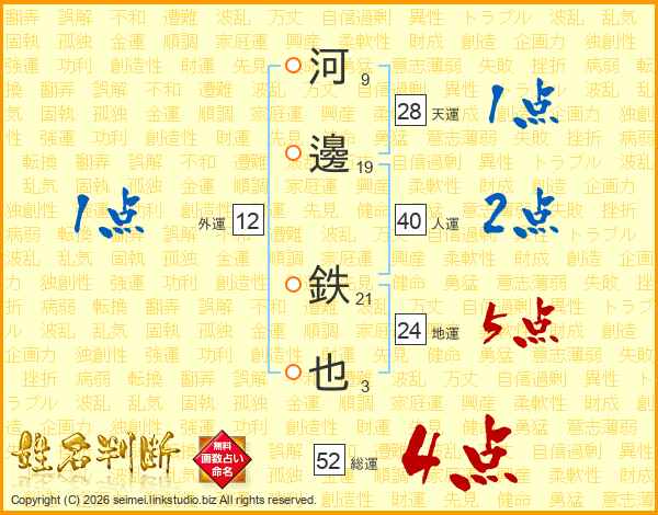 河(9画)邊(19画) 鉄(21画)也(3画)