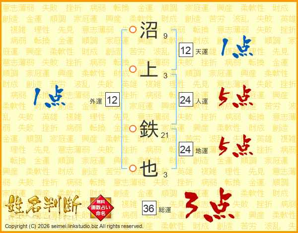 沼(9画)上(3画) 鉄(21画)也(3画)