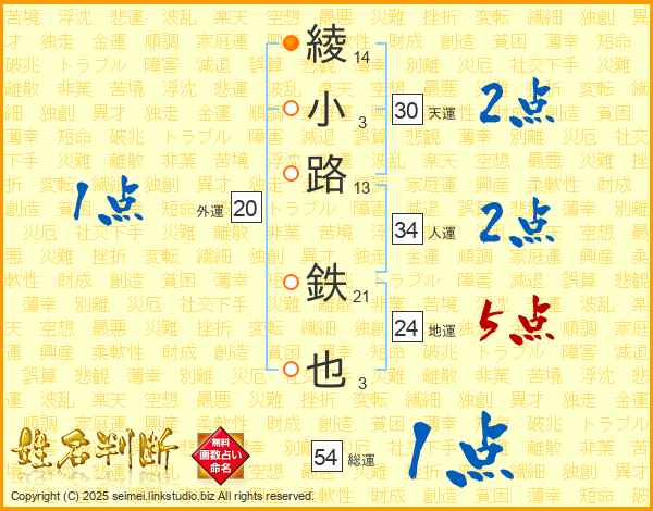 綾(14画)小(3画)路(13画) 鉄(21画)也(3画)