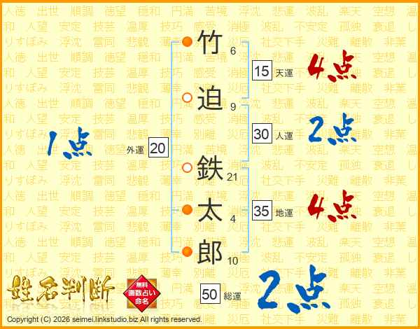 竹(6画)迫(9画) 鉄(21画)太(4画)郎(10画)