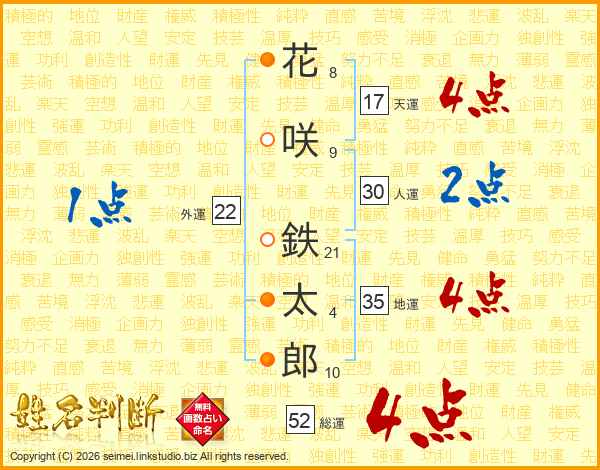 花(8画)咲(9画) 鉄(21画)太(4画)郎(10画)