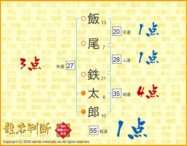 飯(13画)尾(7画) 鉄(21画)太(4画)郎(10画)