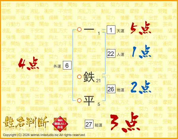 あなたの人生を表す1番重要な運勢です。生涯を通じて影響する総合運となり、主に50歳以降の晩年期に影響を及ぼします。苗字と名前の合計画数。