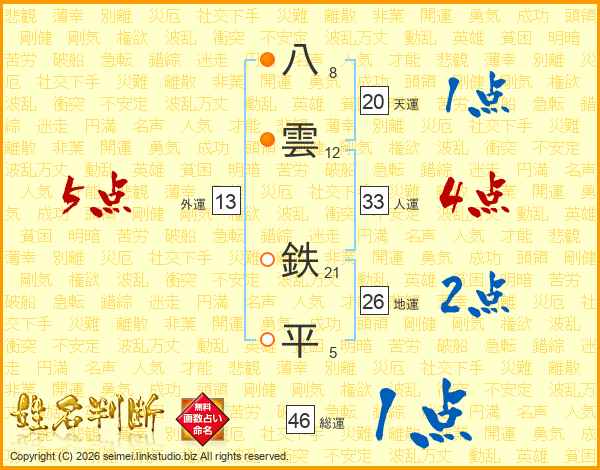 八(8画)雲(12画) 鉄(21画)平(5画)