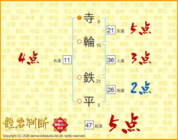 寺(6画)輪(15画) 鉄(21画)平(5画)