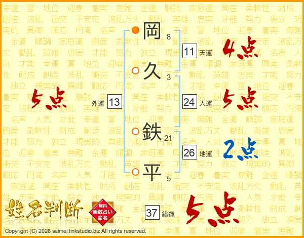 岡(8画)久(3画) 鉄(21画)平(5画)
