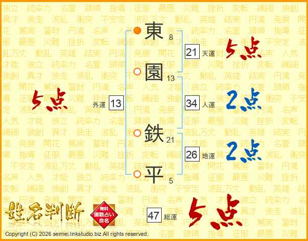 生活面を象徴する運勢です。外部から受ける影響力を表し、結婚運、家庭運や職場、環境への順応性を表します。総運から人運を引いた画数。姓や名が1文字の場合を除く。
