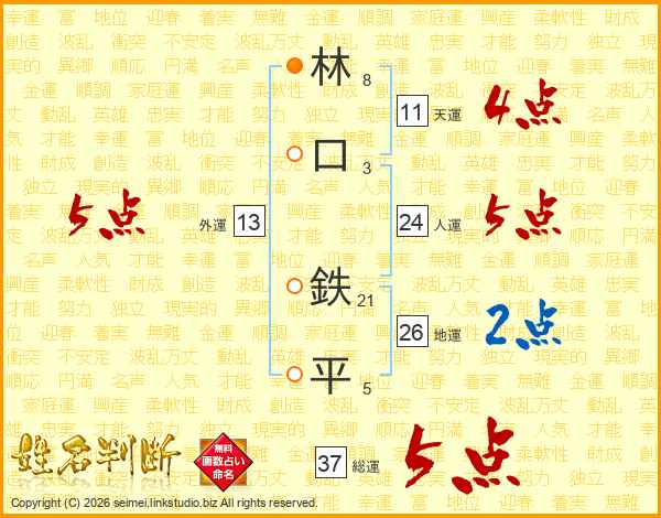 あなたの人生を表す1番重要な運勢です。生涯を通じて影響する総合運となり、主に50歳以降の晩年期に影響を及ぼします。苗字と名前の合計画数。