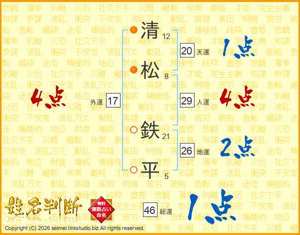 生活面を象徴する運勢です。外部から受ける影響力を表し、結婚運、家庭運や職場、環境への順応性を表します。総運から人運を引いた画数。姓や名が1文字の場合を除く。