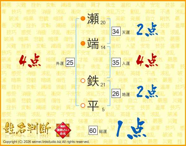 瀬端鉄平さんの総運は60画の1点!