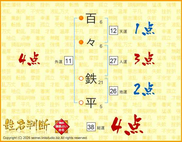 家系が持つ宿命的な運勢を表します。祖先から受け継いだ苗字ですので自分の力が及びません。家柄を象徴します。苗字の合計画数。