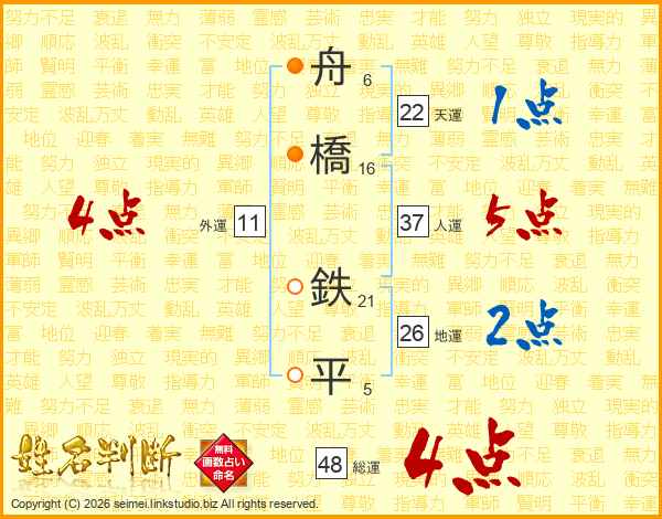 舟(6画)橋(16画) 鉄(21画)平(5画)