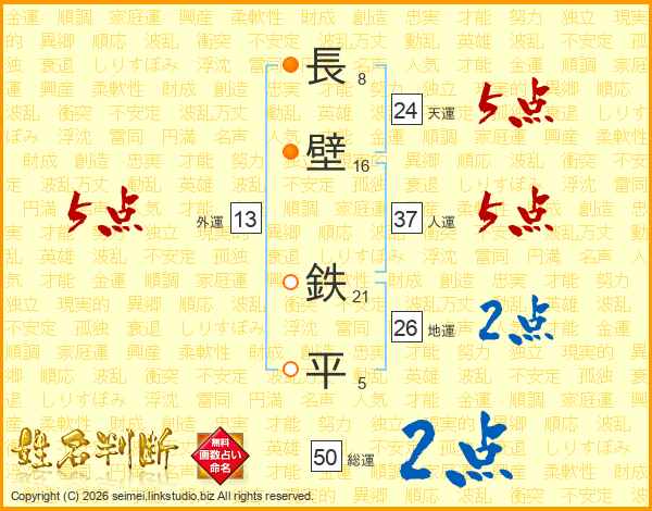 長(8画)壁(16画) 鉄(21画)平(5画)