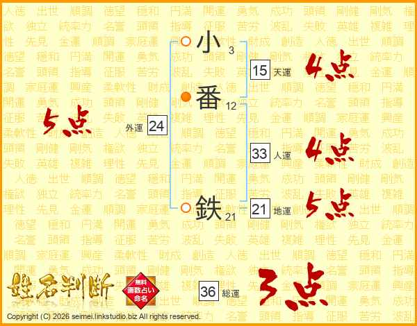 生活面を象徴する運勢です。外部から受ける影響力を表し、結婚運、家庭運や職場、環境への順応性を表します。総運から人運を引いた画数。姓や名が1文字の場合を除く。