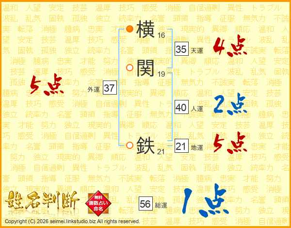 生活面を象徴する運勢です。外部から受ける影響力を表し、結婚運、家庭運や職場、環境への順応性を表します。総運から人運を引いた画数。姓や名が1文字の場合を除く。