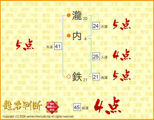瀧内鉄さんの総運は45画の4点!