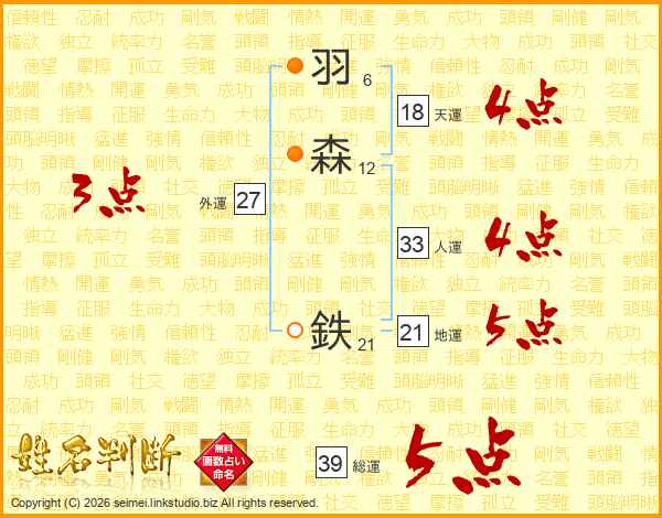 家系が持つ宿命的な運勢を表します。祖先から受け継いだ苗字ですので自分の力が及びません。家柄を象徴します。苗字の合計画数。