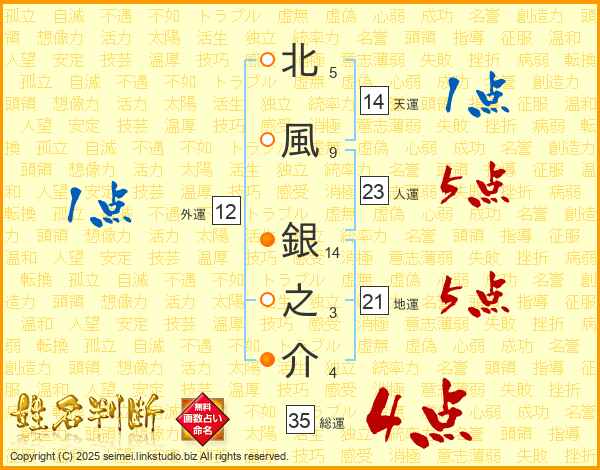 北(5画)風(9画) 銀(14画)之(3画)介(4画)