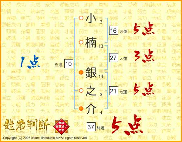 小(3画)楠(13画) 銀(14画)之(3画)介(4画)