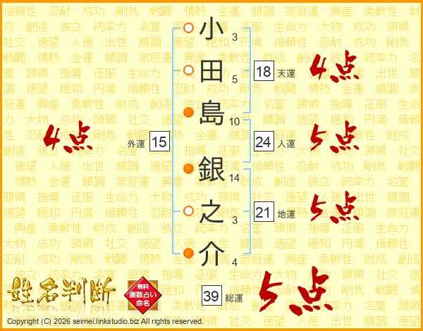 小田島銀之介さんの総運は39画の5点!