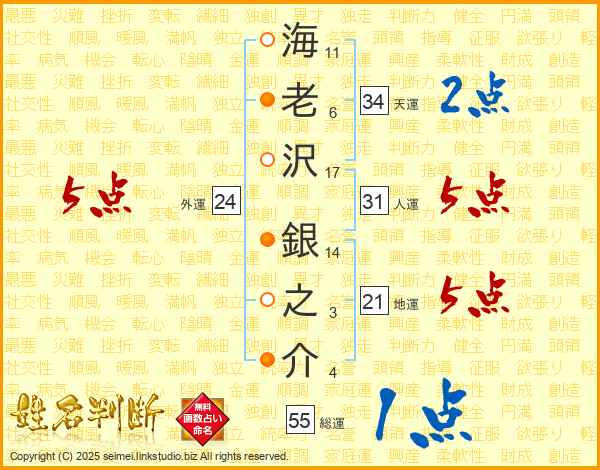 海(11画)老(6画)沢(17画) 銀(14画)之(3画)介(4画)