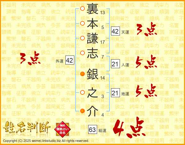 裏(13画)本(5画)謙(17画)志(7画) 銀(14画)之(3画)介(4画)