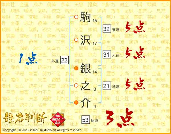 駒沢銀之介さんの総運は53画の3点!