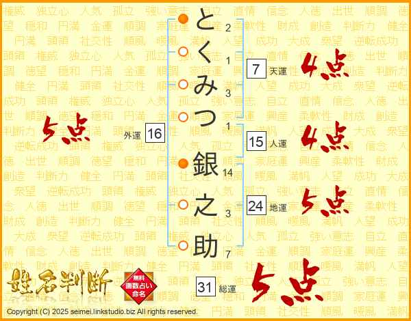 と(2画)く(1画)み(3画)つ(1画) 銀(14画)之(3画)助(7画)
