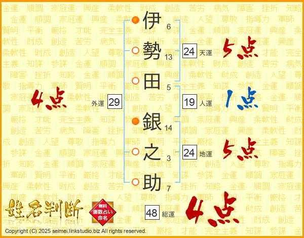伊(6画)勢(13画)田(5画) 銀(14画)之(3画)助(7画)