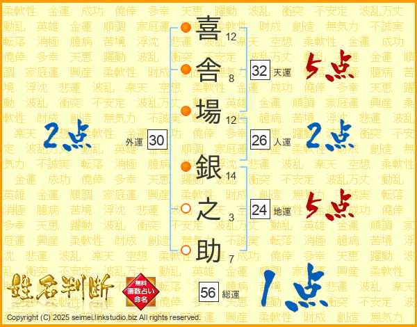 喜(12画)舎(8画)場(12画) 銀(14画)之(3画)助(7画)