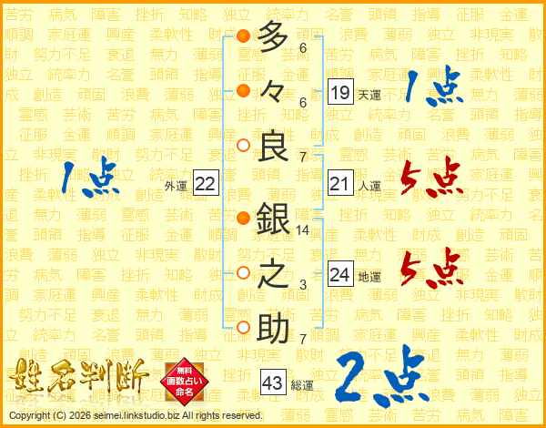 多々良銀之助さんの総運は43画の2点!
