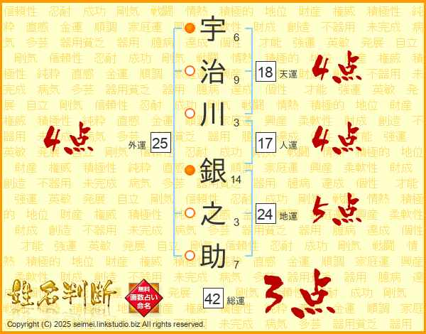 宇(6画)治(9画)川(3画) 銀(14画)之(3画)助(7画)