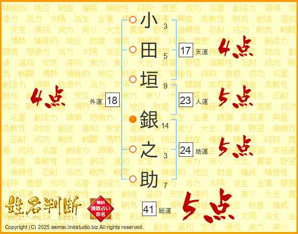 小(3画)田(5画)垣(9画) 銀(14画)之(3画)助(7画)
