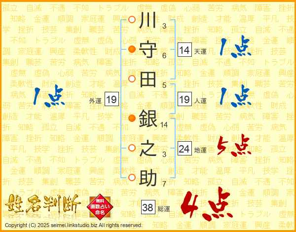 川(3画)守(6画)田(5画) 銀(14画)之(3画)助(7画)