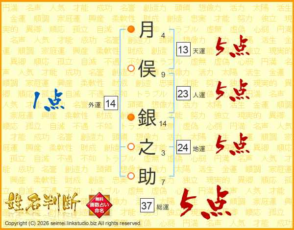 月(4画)俣(9画) 銀(14画)之(3画)助(7画)