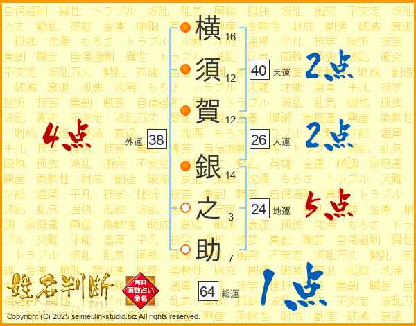 横(16画)須(12画)賀(12画) 銀(14画)之(3画)助(7画)