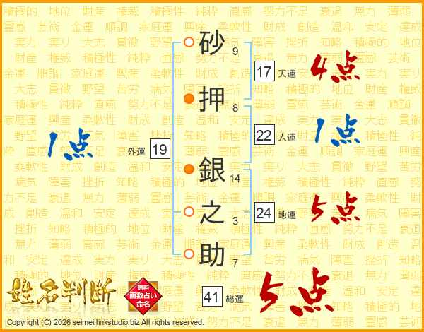 砂押銀之助さんの総運は41画の5点!