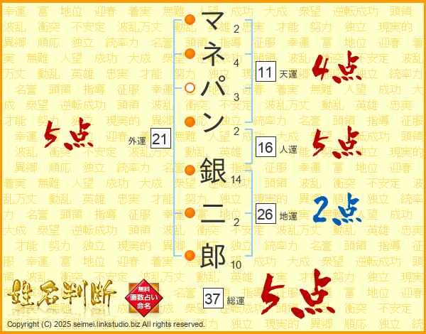 マ(2画)ネ(4画)パ(3画)ン(2画) 銀(14画)二(2画)郎(10画)