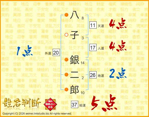 八(8画)子(3画) 銀(14画)二(2画)郎(10画)