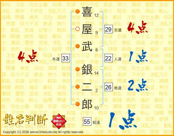 喜(12画)屋(9画)武(8画) 銀(14画)二(2画)郎(10画)