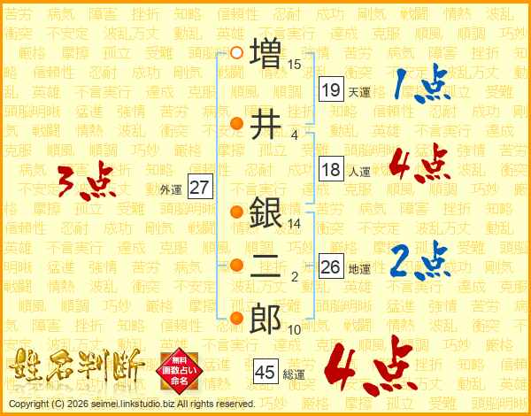 増(15画)井(4画) 銀(14画)二(2画)郎(10画)