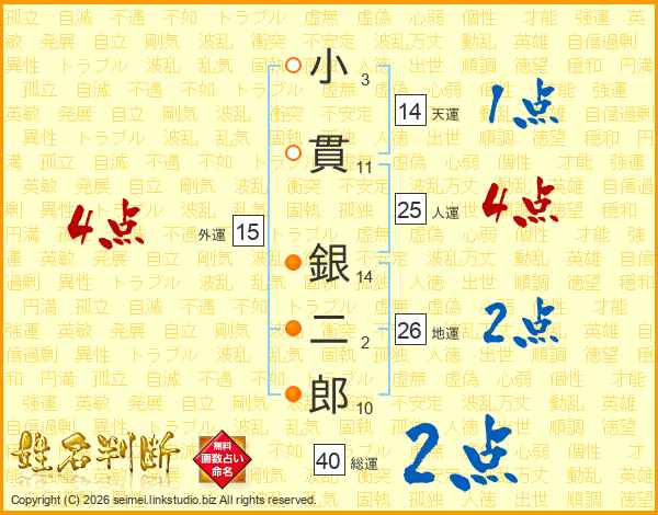 小(3画)貫(11画) 銀(14画)二(2画)郎(10画)
