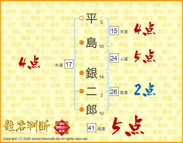 平(5画)島(10画) 銀(14画)二(2画)郎(10画)