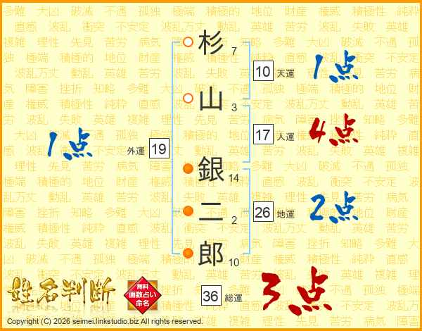 杉(7画)山(3画) 銀(14画)二(2画)郎(10画)