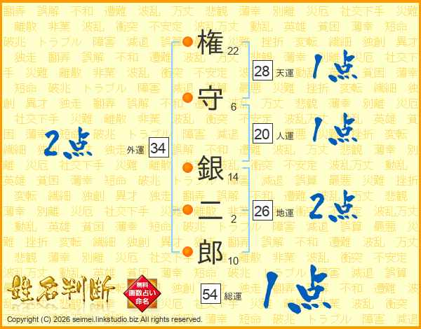 権(22画)守(6画) 銀(14画)二(2画)郎(10画)